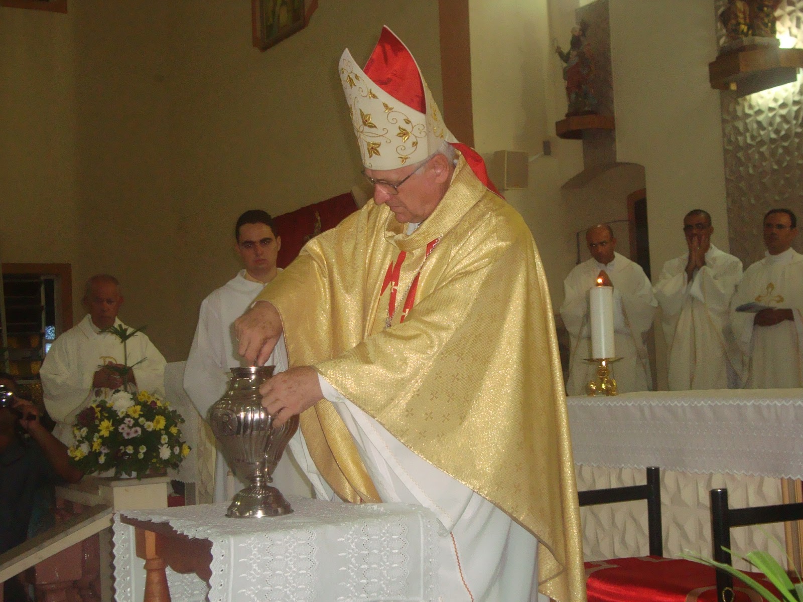 Faz uma pausa e informa aos paroquianos do Sínodo Diocesano, e pede que Pe Jonny faça a sua leitura. O sínodo tem base nos documento de Aparecida e bem como as diretrizes da igreja no Brasil, inicia-se no dia 31/03 com abertura oficial no dia 24/11 encerrando-se no dia 18/12/15, frisa que é o documento mais importante da diocese ,e que é necessário sermos autênticos discípulos missionários de Cristo. Continua sua homilia dizendo que o sacerdócio nasce da eucaristia, pede aos padres que vivam a eucaristia um com outro, pois a eucaristia santifica, faz uma apelo as vocações e finaliza com a passagem bíblica o espirito senhor esta sobre mim....